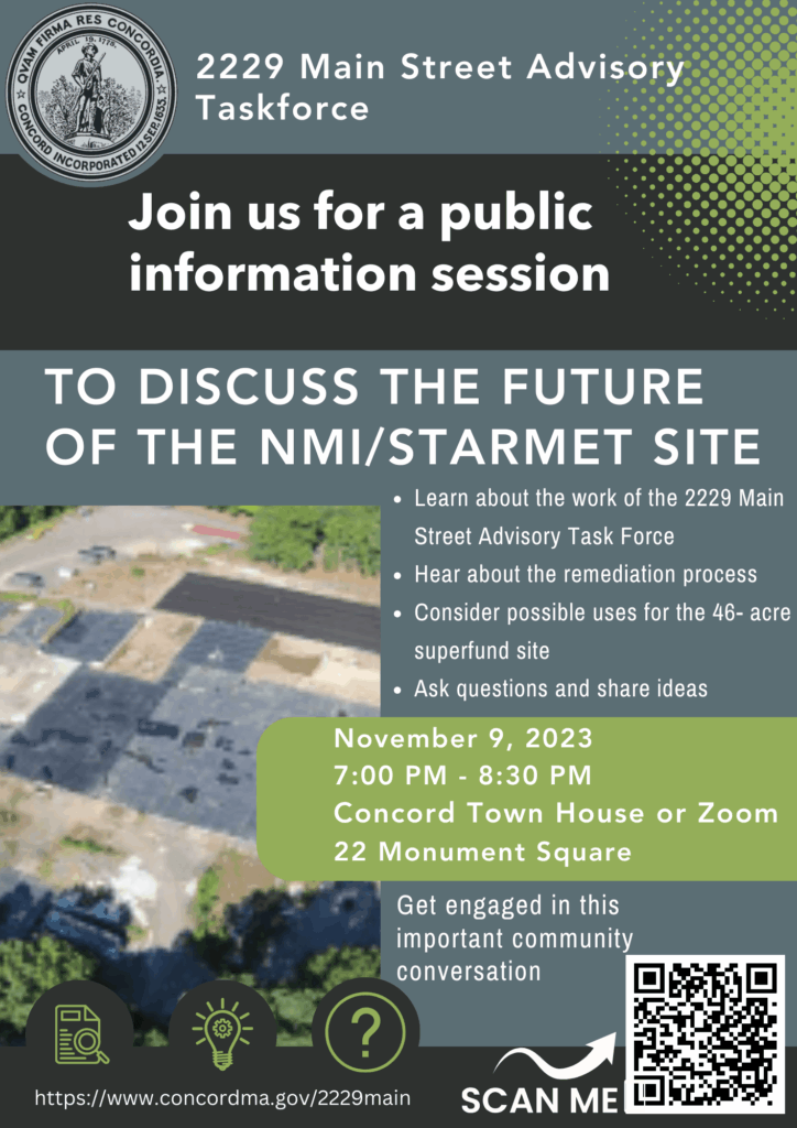 The 2229 Main Street Advisory Task Force is hosting a hybrid public forum on November 9, 2023 at 7 PM – 8:30 PM at the Town House, Public Hearing Room, 22 Monument Square or on Zoom. The meeting will review the charge and work of the task force, outline considerations for possible reuse, answer questions and solicit ideas regarding the NMI/Starmet superfund site. More information can be viewed on the flyer here.